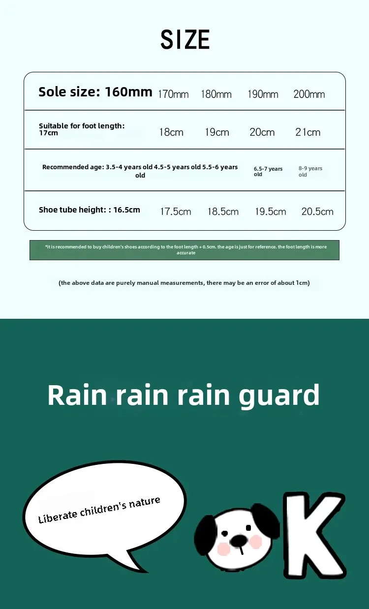 Fazit: Diese wasserdichten Regenstiefel sind der perfekte Begleiter für jedes Wetter. Sie bieten Komfort, Schutz und Vielseitigkeit und sorgen dafür, dass Ihr Kind bei jedem Wetter trocken bleibt. Ideal für den Kindergarten, Ausflüge im Regen oder einfach zum Spielen im Freien. Holen Sie sich noch heute ein Paar und sorgen Sie dafür, dass Ihr Kind stilvoll und bequem durch den Regen geht!