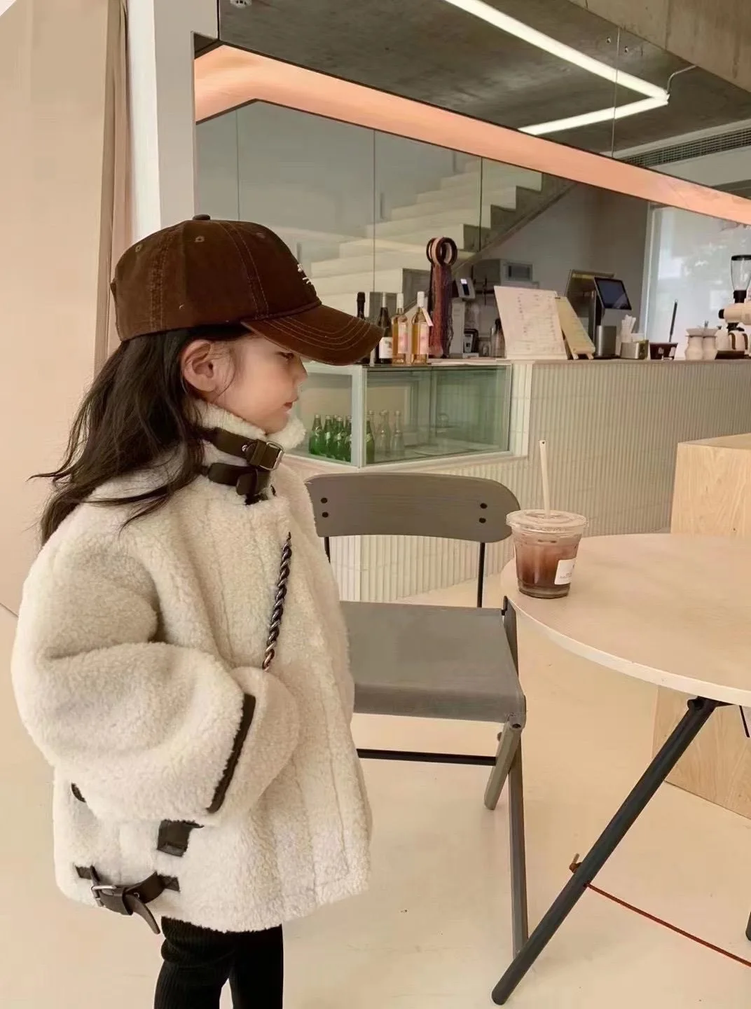 Stylischer Fleece-Mantel für Mädchen – Mit seitlichen Gurten und Halsbereich, in Braun und Weiß