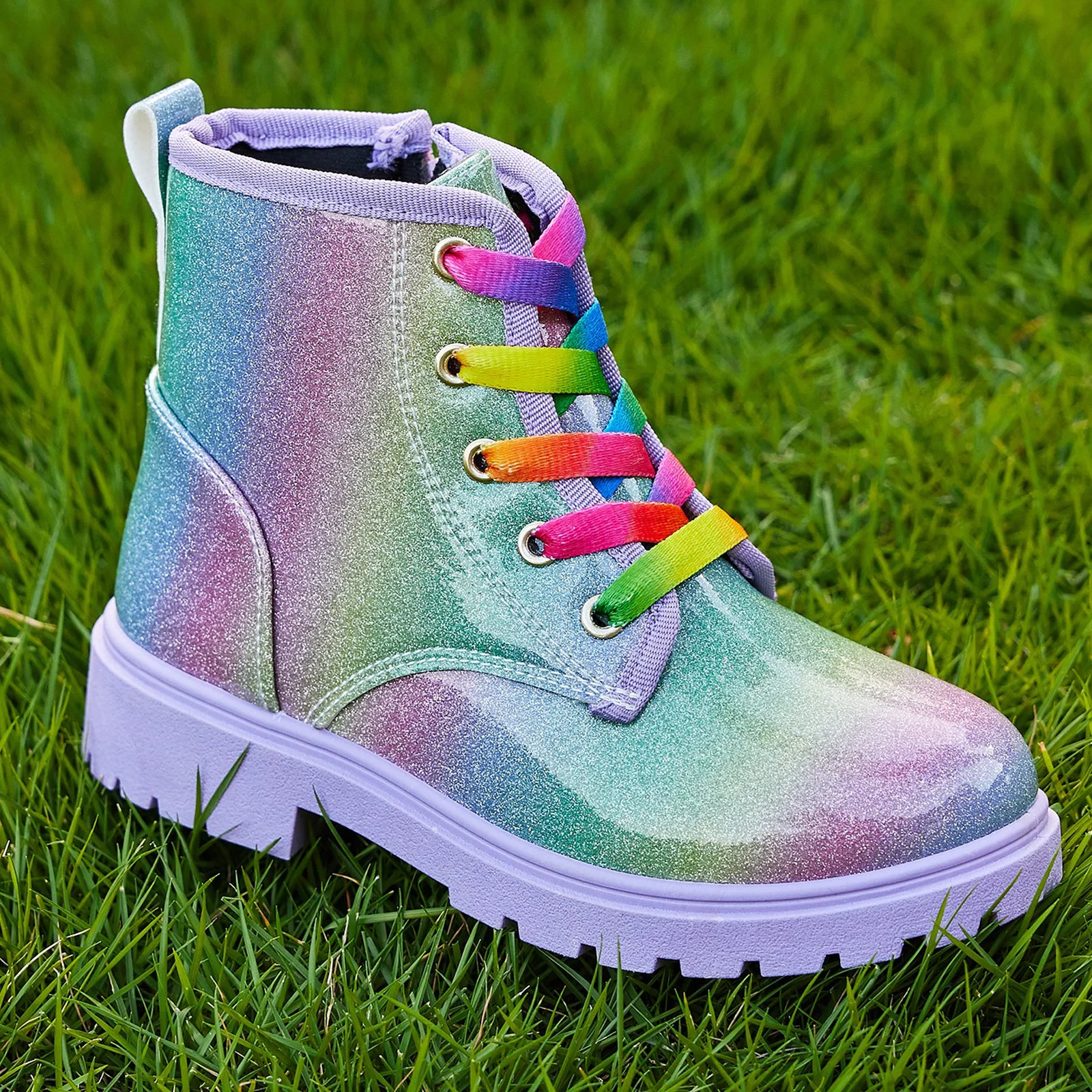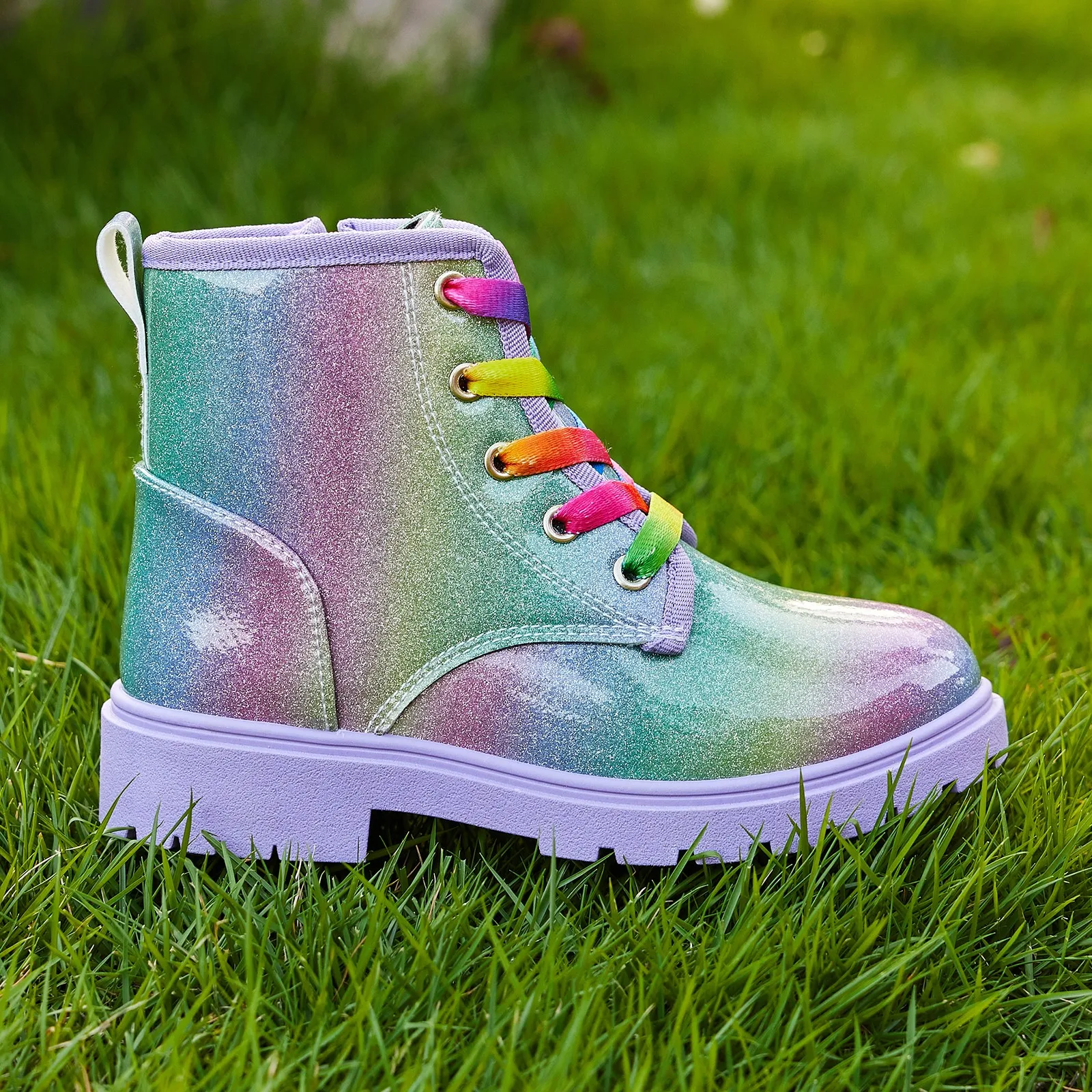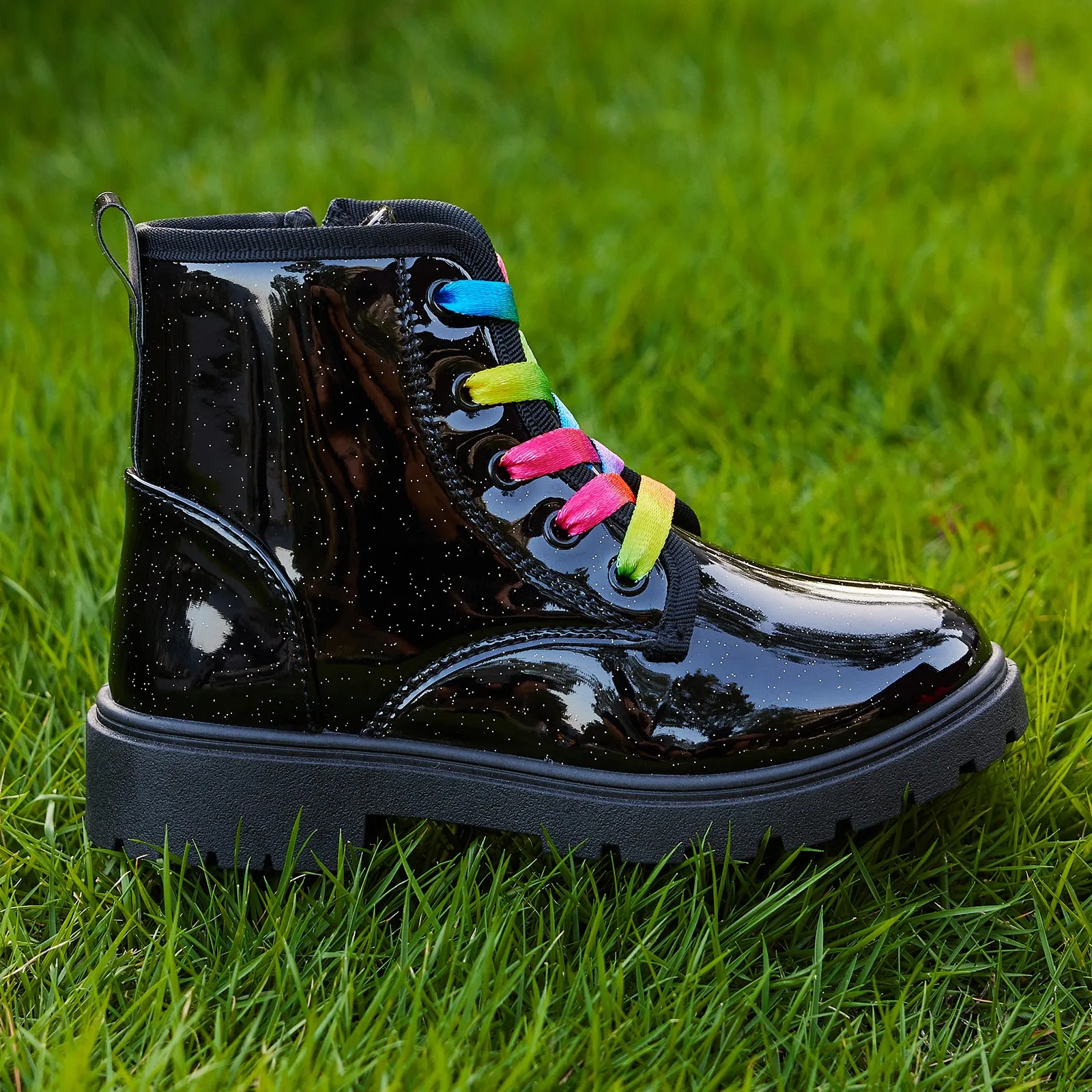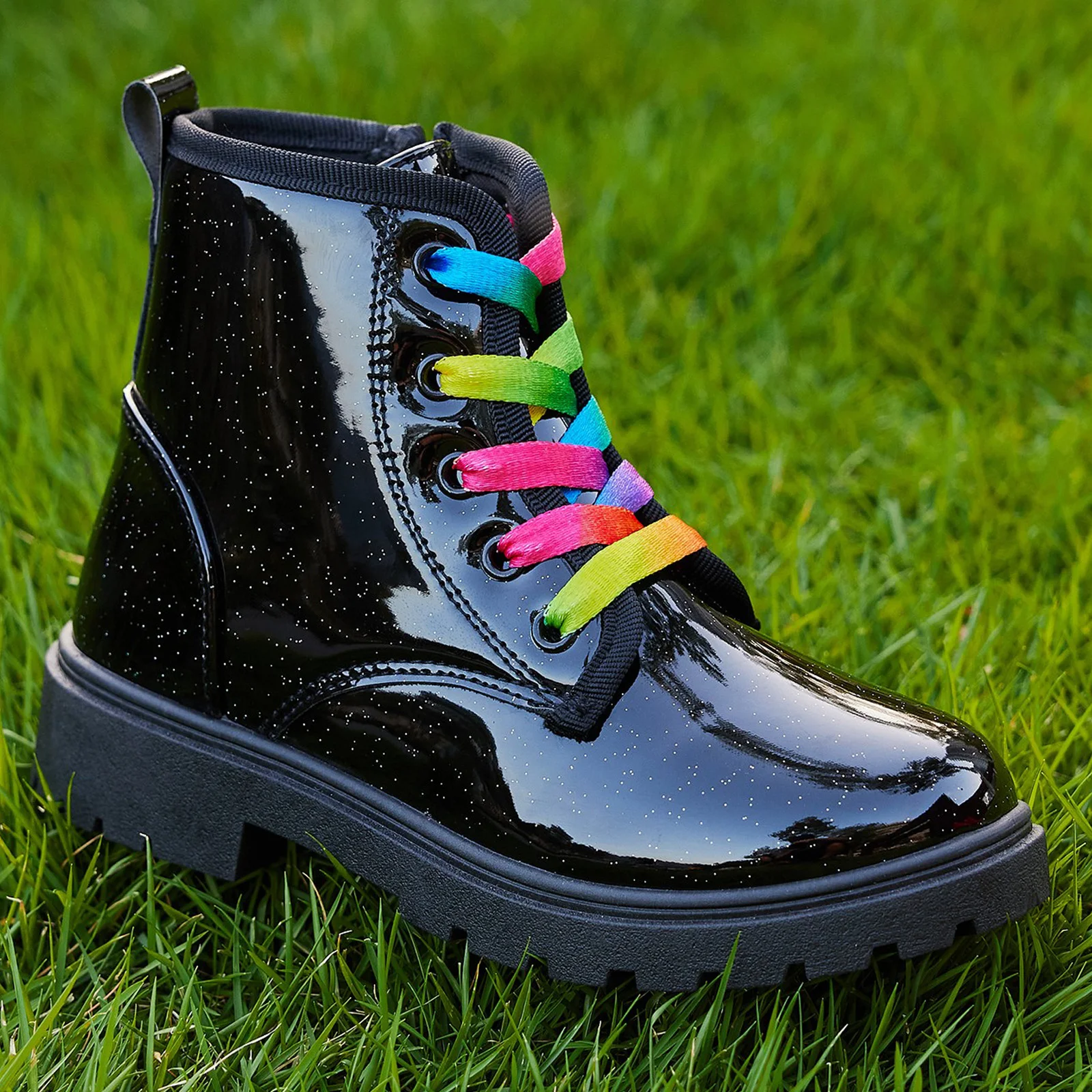 Diese trendigen Lack Boots in Silber und Schwarz sind der perfekte Hingucker für jedes Outfit. Die glänzende Lackoptik sorgt für einen modernen, glänzenden Look, während die auffälligen Regenbogenschnürsenkel dem Schuh einen extra Farbtupfer verleihen. Diese Boots sind nicht nur ein stylisches Accessoire, sondern bieten dank der robusten Sohle auch den nötigen Halt und Komfort für den ganzen Tag. Ideal für Kinder, die gerne auffallen und gleichzeitig bequem unterwegs sein möchten.