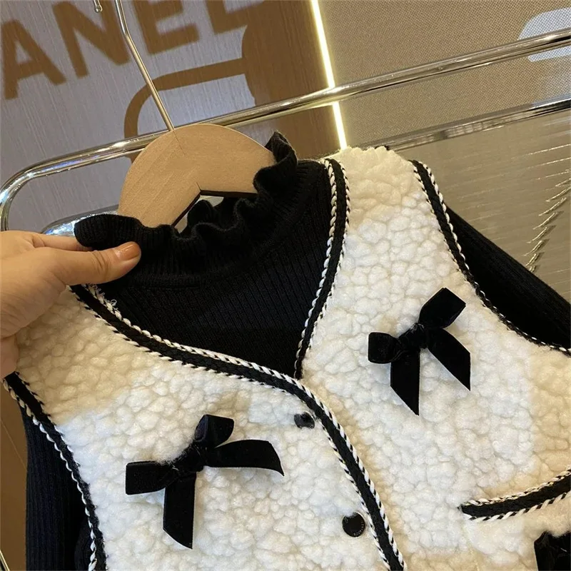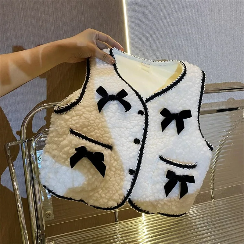 Süße Fleece Weste für Mädchen in Weiß-Beige Kombination – Mit Schwarzen Schleifen, Einzigartiger Look