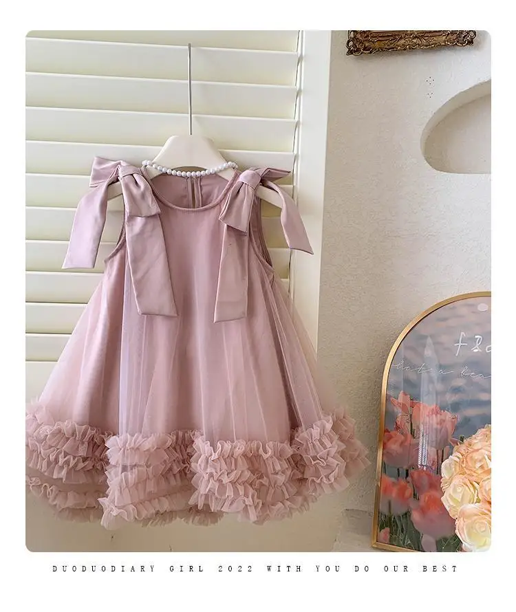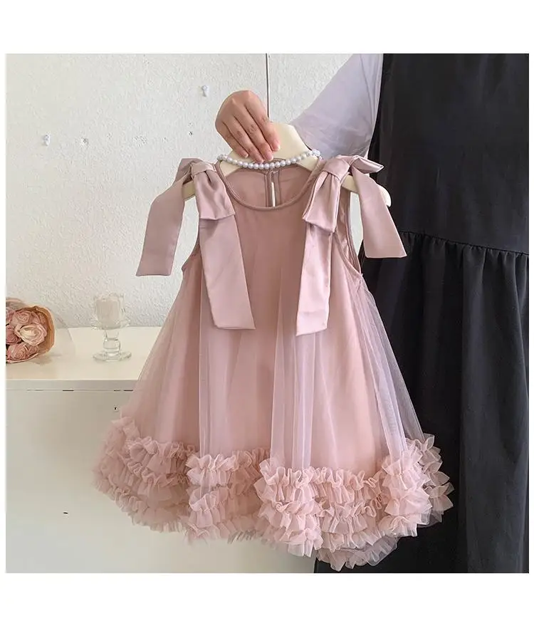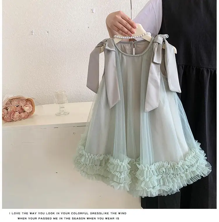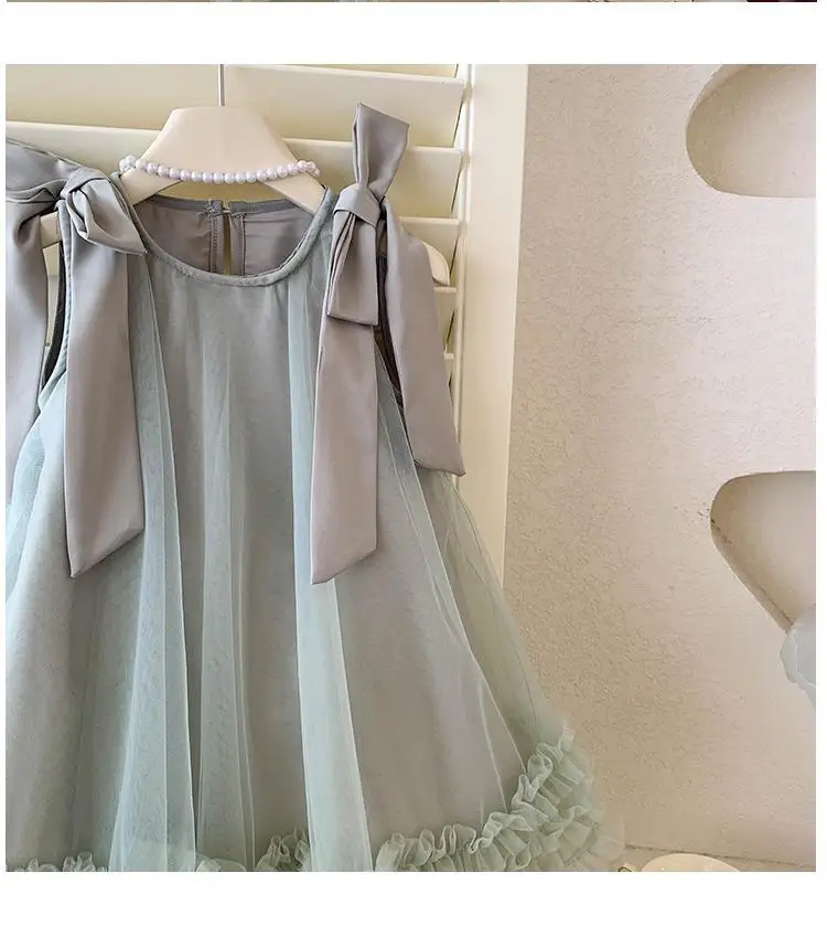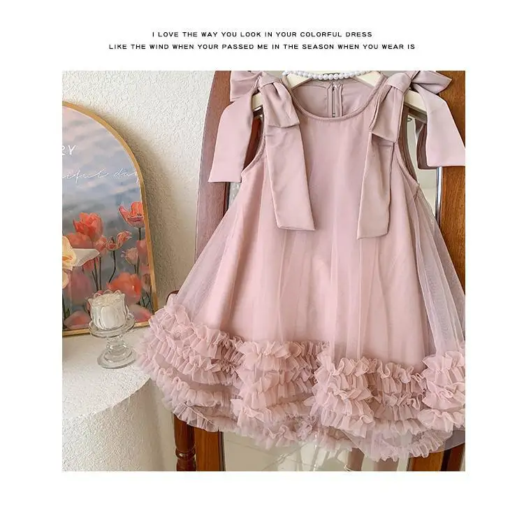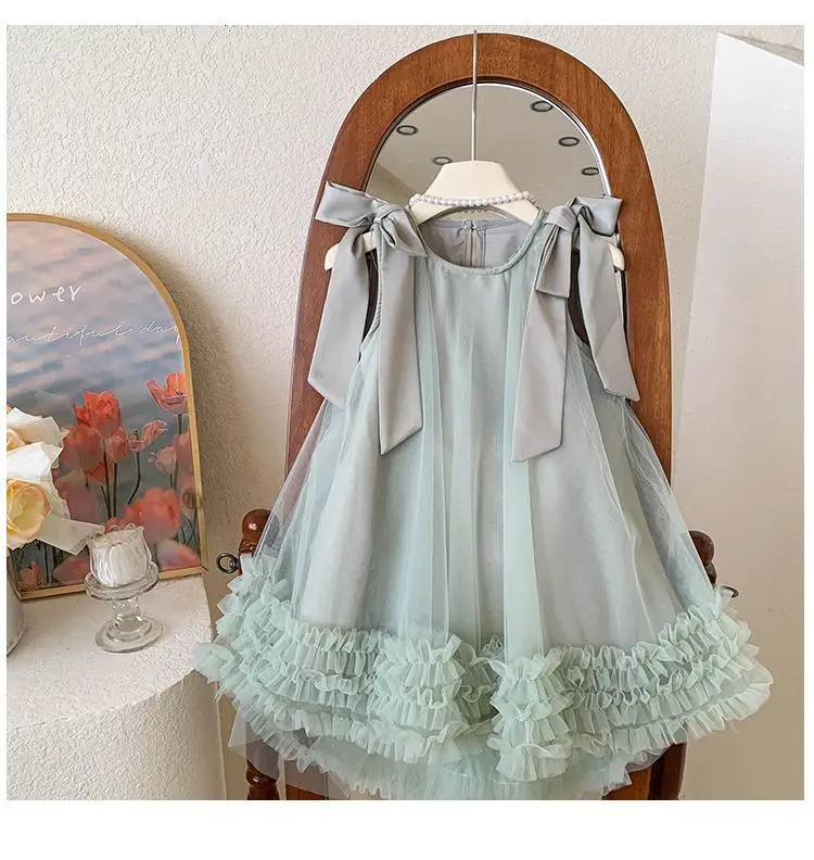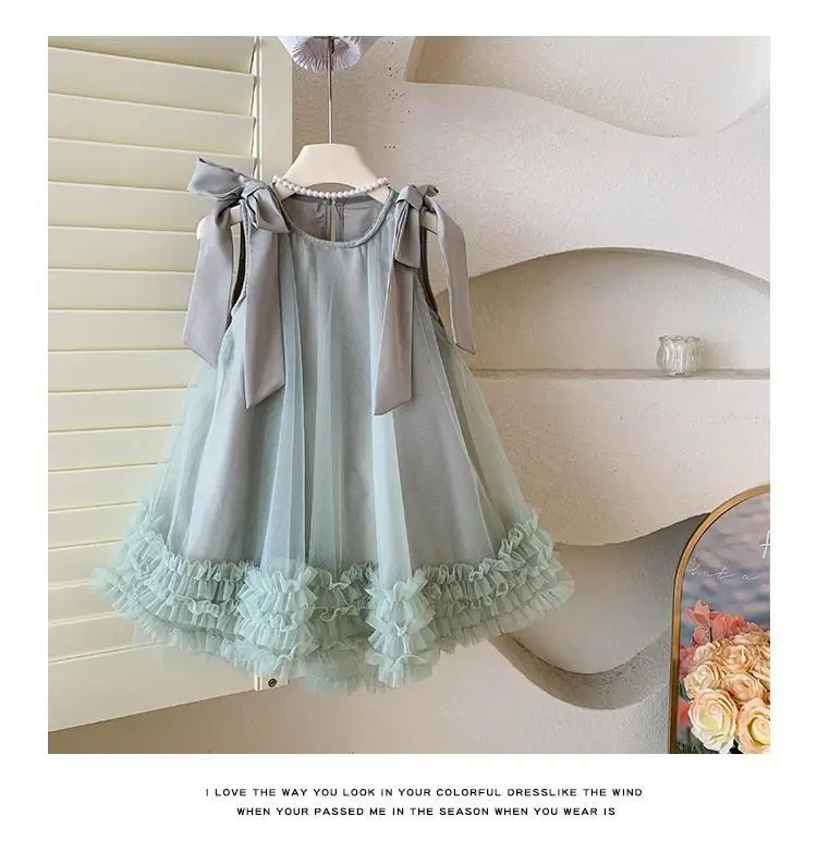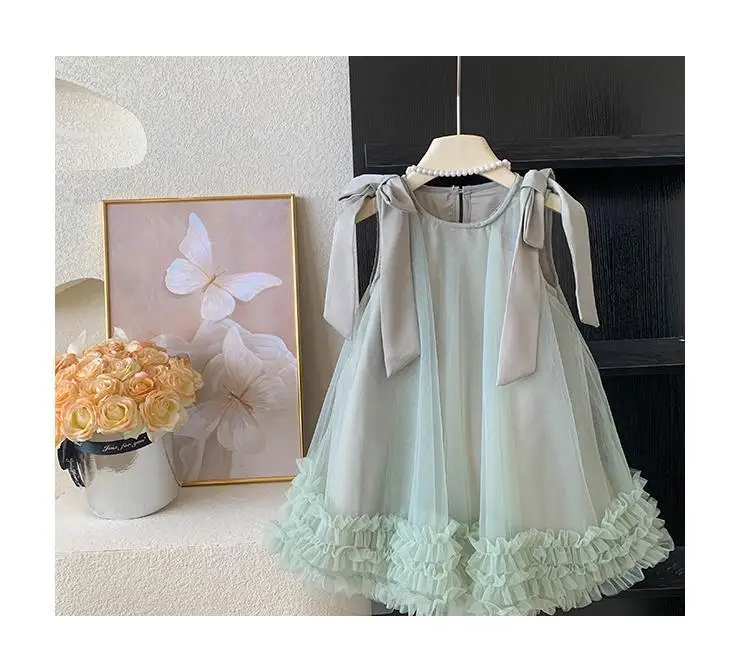 Produktbeschreibung: Sommer Mädchen Prinzessin Kleid Ärmlos mit Schleife – Einfarbig in Grün und Rosa