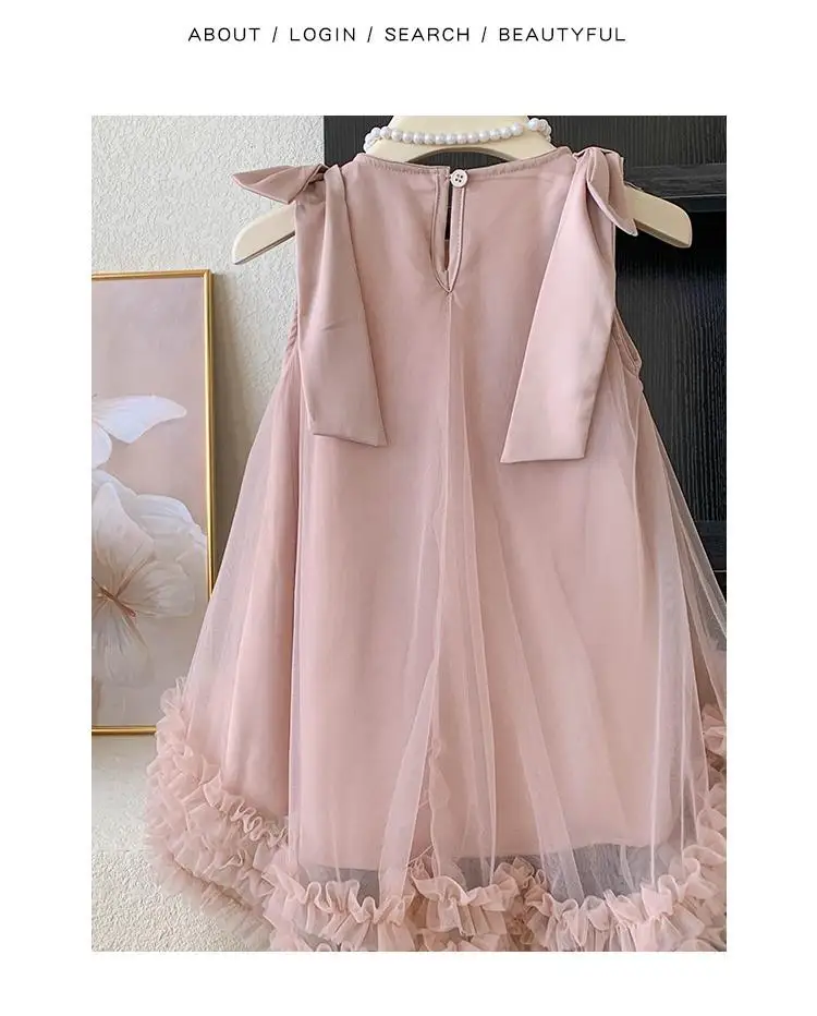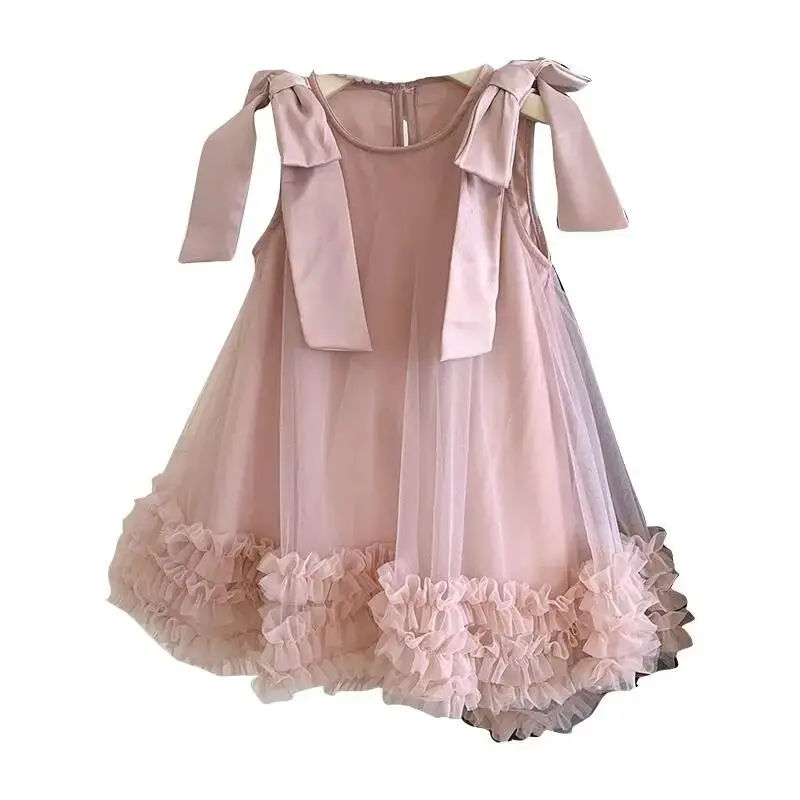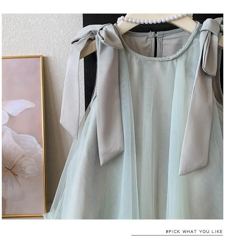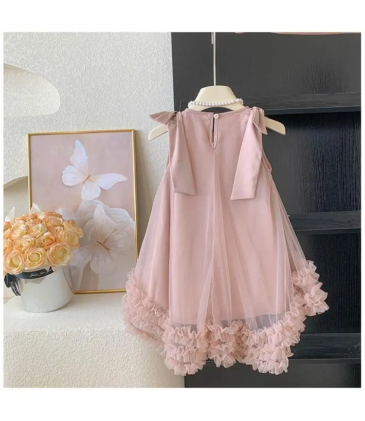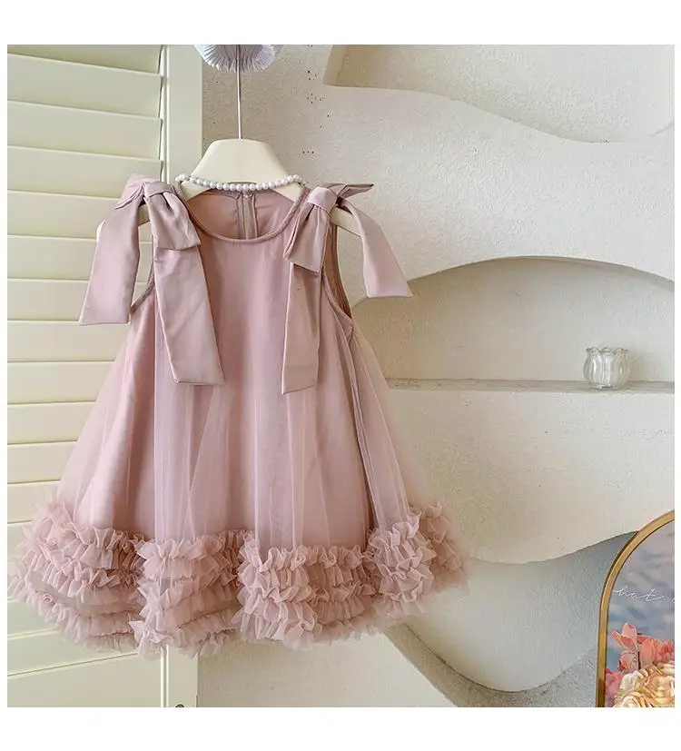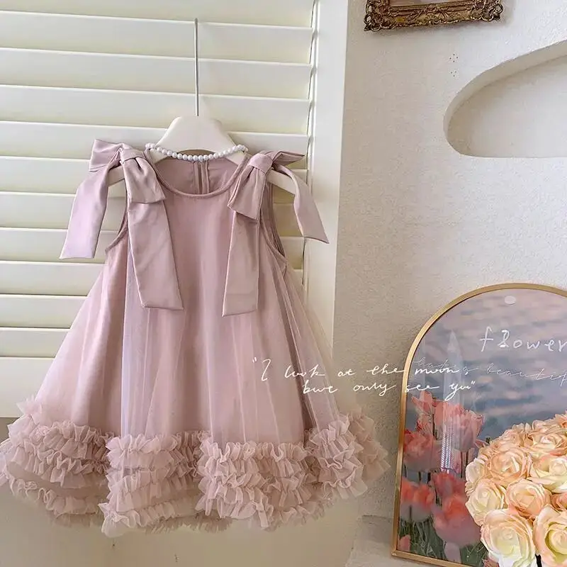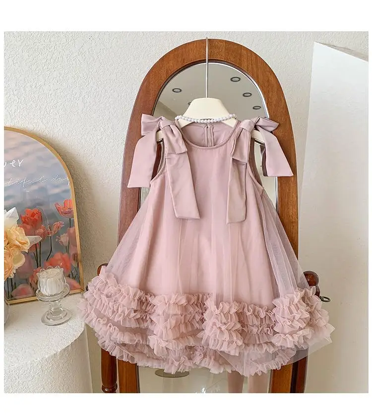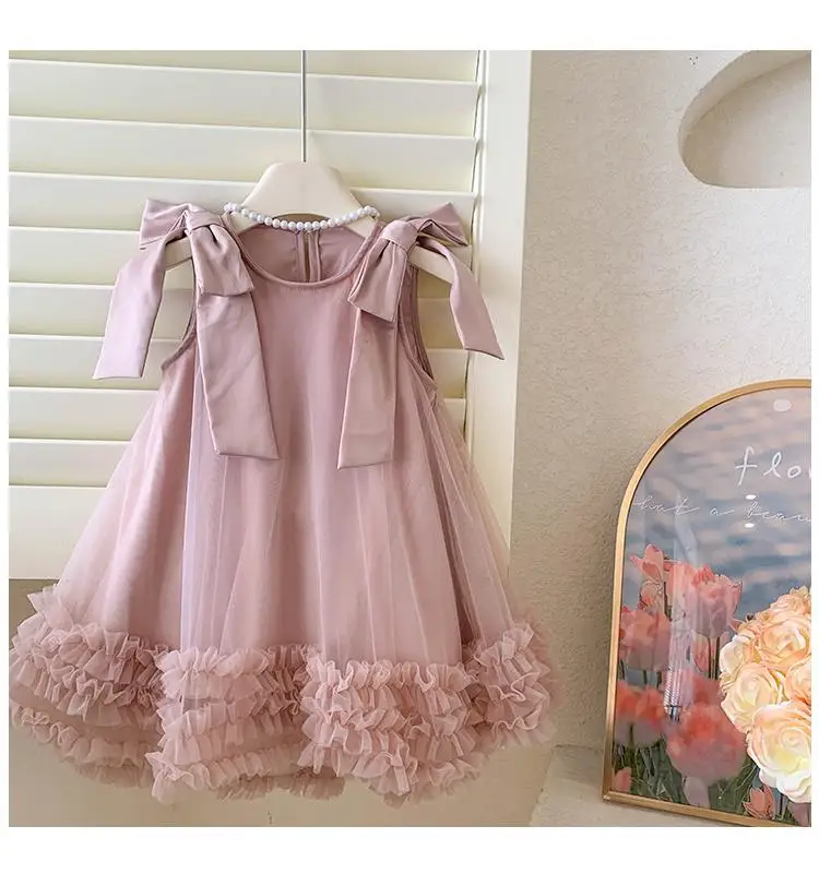 Produktbeschreibung: Sommer Mädchen Prinzessin Kleid Ärmlos mit Schleife – Einfarbig in Grün und Rosa