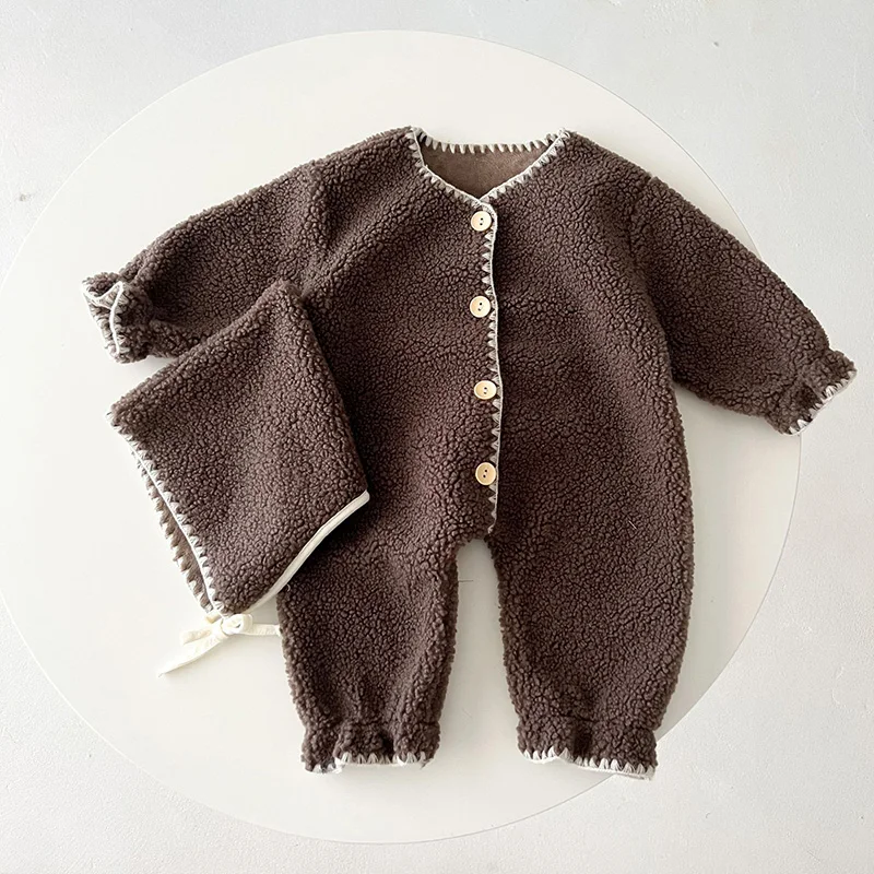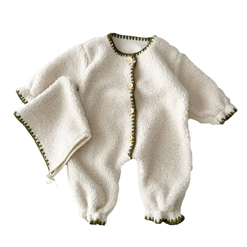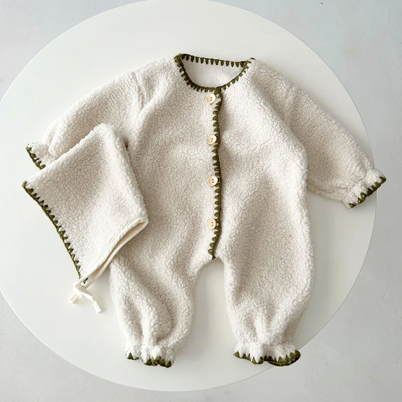 Dieser Winter Baby Romper aus Lammwolle ist der perfekte Jumpsuit für Jungen und Mädchen im Alter von 0-3 Jahren. Das Set enthält einen weichen, kuscheligen Romper und eine passende Mütze, die Ihr Baby an kalten Tagen warm hält. Der losere Schnitt sorgt für eine bequeme Passform und viel Bewegungsfreiheit. Ideal für den Winter, bietet dieser plüschige Babyanzug sowohl Stil als auch Komfort für Ihr kleines Kind. Ein absolutes Must-Have für die kalte Jahreszeit!